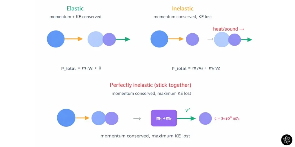 Here’s the really important difference: momentum is always conserved in collisions. Kinetic energy is only conserved in elastic ones. In every inelastic collision, some kinetic energy disappears into heat, sound, and deformation — but momentum stays exactly the same.